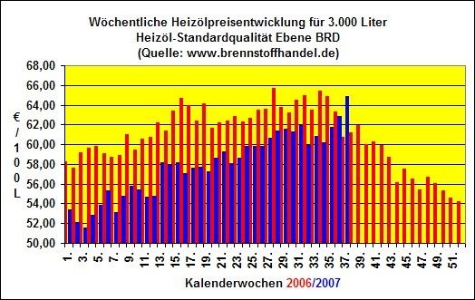 64,75 Euro/100 l und verteuerte sich gegenüber der Vorwoche um 1,97 Euro/100 l und erreichte damit für das laufende Jahr eine neue Rekordmarke. Der Heizölpreis lag in der 37. KW nur noch 0,98 Euro/100 l unter dem Höchststand in 2006, der in der 28. KW 2006 mit 65,63 Euro/100 l erreicht wurde.