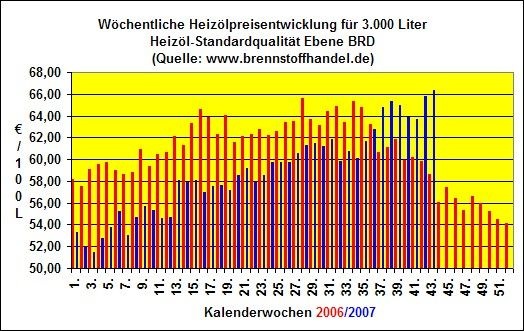 66,32 Euro/100 l und verteuerte sich gegenüber der Vorwoche um 0,55 Euro/100 l. Der Heizölpreis lag in der 43. KW um 0,69 Euro/100 l über dem Höchststand in 2006, der in der 28. KW 2006 mit 65,63 Euro/100 l erreicht wurde.