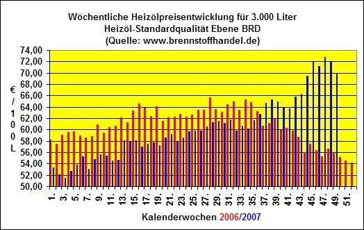 69,82 Euro/100 l und verbilligte sich gegenüber der Vorwoche um 2,18 Euro/100 l. Der Heizölpreis lag damit um 3,01 Euro/100 l unter dem Allzeithoch der 47. KW 2007 mit 72,83 Euro/100 l.