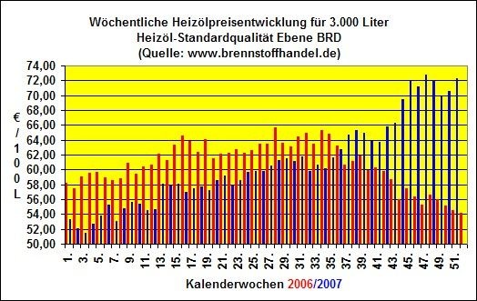 72,29 Euro/100 l und verteuerte sich gegenüber der Vorwoche um 1,68 Euro/100 l. Der Heizölpreis lag damit nur um 0,54 Euro/100 l unter dem Allzeithoch der 47. KW 2007 mit 72,83 Euro/100 l.