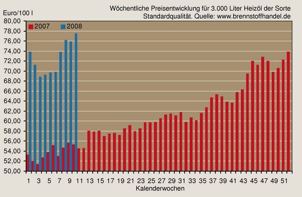 im Bundesdurchschnitt 77,55 Euro/100 l und verteuerte sich gegenüber der Vorwoche um 1,63 Euro/100 l. Der Heizölpreis lag somit um 1,37 Euro/100 l über dem bisherigen Allzeithoch von 76,18 Euro/100 l, das in der 8. KW 2008 erreicht worden war.