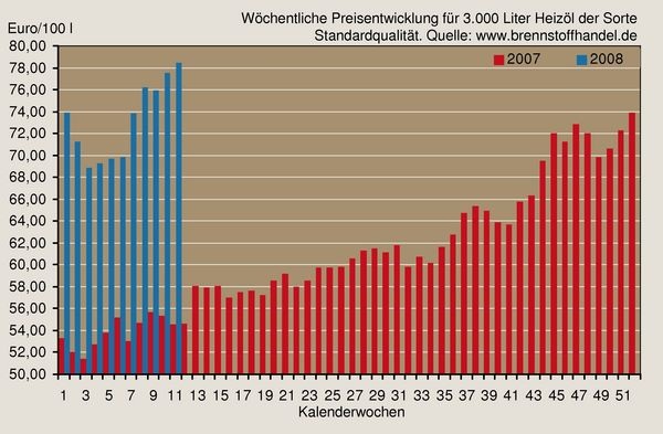 Heizölpreisentwicklung laut „Preise und Preisindizes für gewerbliche Produkte“ des Statistischen Bundesamts bei Lieferung in TKW an Verbraucher frei Verbraucher bei 4000 bis 5000 l pro Auftrag weist für Februar 2008 einen Preis von 71,81 Euro/100 l aus. Dieser Mittelwert wird aus den Preisen für Kiel, Hamburg, Hannover, Düsseldorf, Frankfurt am Main, Mannheim/Ludwigshafen, Stuttgart, München, Berlin, Rostock, Magdeburg und Dresden, inkl. Mineralölsteuer, Ökosteuer, Erdölbevorratungsbeitrag und Mehrwertsteuer jeweils am 15. des Monats ermittelt. ToR