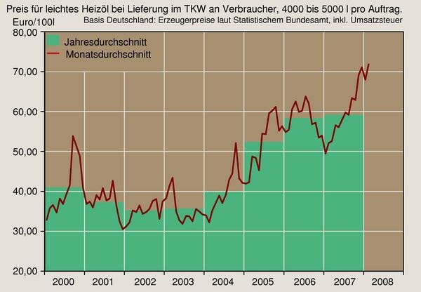 Heizölpreisentwicklung laut „Preise und Preisindizes für gewerbliche Produkte“ des Statistischen Bundesamts bei Lieferung in TKW an Verbraucher frei Verbraucher bei 4000 bis 5000 l pro Auftrag weist für Februar 2008 einen Preis von 71,81 Euro/100 l aus. Dieser Mittelwert wird aus den Preisen für Kiel, Hamburg, Hannover, Düsseldorf, Frankfurt am Main, Mannheim/Ludwigshafen, Stuttgart, München, Berlin, Rostock, Magdeburg und Dresden, inkl. Mineralölsteuer, Ökosteuer, Erdölbevorratungsbeitrag und Mehrwertsteuer jeweils am 15. des Monats ermittelt. ToR
