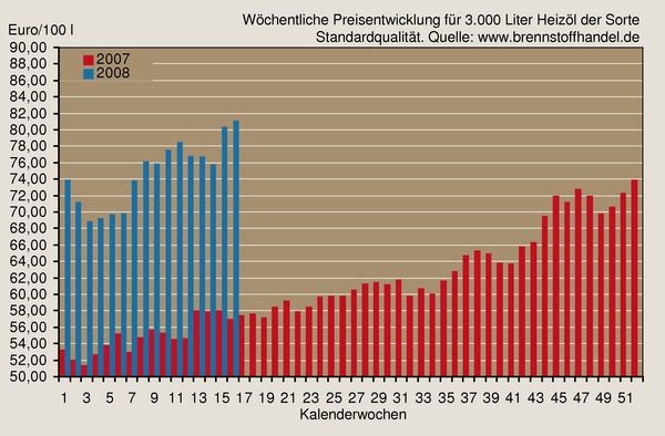 Heizölpreisentwicklung laut „Preise und Preisindizes für gewerbliche Produkte“ des Statistischen Bundesamts bei Lieferung in TKW an Verbraucher frei Verbraucher bei 4000 bis 5000 l pro Auftrag weist für März 2008 einen Preis von 75,09 Euro/100 l aus. Dieser Mittelwert wird aus den Preisen für Kiel, Hamburg, Hannover, Düsseldorf, Frankfurt am Main, Mannheim/Ludwigshafen, Stuttgart, München, Berlin, Rostock, Magdeburg und Dresden, inkl. Mineralölsteuer, Ökosteuer, Erdölbevorratungsbeitrag und Mehrwertsteuer jeweils am 15. des Monats ermittelt. ToR