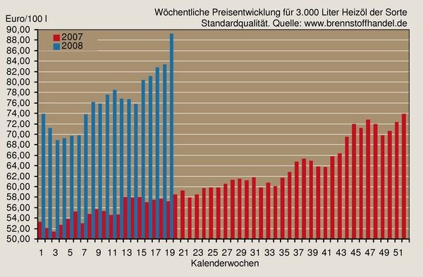 Heizölpreisentwicklung laut „Preise und Preisindizes für gewerbliche Produkte“ des Statistischen Bundesamts bei Lieferung in TKW an Verbraucher frei Verbraucher bei 4000 bis 5000 l pro Auftrag weist für März 2008 einen Preis von 75,09 Euro/100 l aus. Dieser Mittelwert wird aus den Preisen für Kiel, Hamburg, Hannover, Düsseldorf, Frankfurt am Main, Mannheim/Ludwigshafen, Stuttgart, München, Berlin, Rostock, Magdeburg und Dresden, inkl. Mineralölsteuer, Ökosteuer, Erdölbevorratungsbeitrag und Mehrwertsteuer jeweils am 15. des Monats ermittelt. ToR