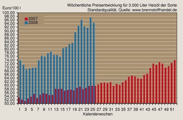 Die Heizölpreisentwicklung laut „Preise und Preisindizes für gewerbliche Produkte“ des Statistischen Bundesamts bei Lieferung in TKW an Verbraucher frei Verbraucher bei 4000 bis 5000 l pro Auftrag weist für Mai 2008 einen Preis von 89,51 Euro/100 l aus (+14,0% über dem Vormonat, +59,7% über dem Vorjahresmonat). Dieser Mittelwert wird aus den Preisen für Kiel, Hamburg, Hannover, Düsseldorf, Frankfurt am Main, Mannheim/Ludwigshafen, Stuttgart, München, Berlin, Rostock, Magdeburg und Dresden, inkl. Mineralölsteuer, Ökosteuer, Erdölbevorratungsbeitrag und Mehrwertsteuer jeweils am 15. des Monats ermittelt. ToR