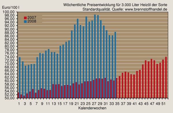 Die Heizölpreisentwicklung laut „Preise und Preisindizes für gewerbliche Produkte“ des Statistischen Bundesamts bei Lieferung in TKW an Verbraucher frei Verbraucher bei 4000 bis 5000 l pro Auftrag weist für Juli 2008 einen Preis von 95,02 Euro/100 l aus (+1,2% über dem Vormonat, +58,8% über dem Vorjahresmonat). Dieser Mittelwert wird aus den Preisen für Kiel, Hamburg, Hannover, Düsseldorf, Frankfurt am Main, Mannheim/Ludwigshafen, Stuttgart, München, Berlin, Rostock, Magdeburg und Dresden, inkl. Mineralölsteuer, Ökosteuer, Erdölbevorratungsbeitrag und Mehrwertsteuer jeweils am 15. des Monats ermittelt. ToR