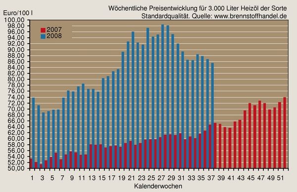 Die Heizölpreisentwicklung laut „Preise und Preisindizes für gewerbliche Produkte“ des Statistischen Bundesamts bei Lieferung in TKW an Verbraucher frei Verbraucher bei 4000 bis 5000 l pro Auftrag weist für Juli 2008 einen Preis von 95,02 Euro/100 l aus (+1,2% über dem Vormonat, +58,8% über dem Vorjahresmonat). Dieser Mittelwert wird aus den Preisen für Kiel, Hamburg, Hannover, Düsseldorf, Frankfurt am Main, Mannheim/Ludwigshafen, Stuttgart, München, Berlin, Rostock, Magdeburg und Dresden, inkl. Mineralölsteuer, Ökosteuer, Erdölbevorratungsbeitrag und Mehrwertsteuer jeweils am 15. des Monats ermittelt. ToR