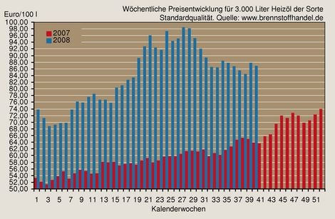 Die Heizölpreisentwicklung laut „Preise und Preisindizes für gewerbliche Produkte“ des Statistischen Bundesamts bei Lieferung in TKW an Verbraucher frei Verbraucher bei 4000 bis 5000 l pro Auftrag weist für August 2008 einen Preis von 82,19 Euro/100 l aus (+13,5% über dem Vormonat, +38,8% über dem Vorjahresmonat). Dieser Mittelwert wird aus den Preisen für Kiel, Hamburg, Hannover, Düsseldorf, Frankfurt am Main, Mannheim/Ludwigshafen, Stuttgart, München, Berlin, Rostock, Magdeburg und Dresden, inkl. Mineralölsteuer, Ökosteuer, Erdölbevorratungsbeitrag und Mehrwertsteuer jeweils am 15. des Monats ermittelt. ToR