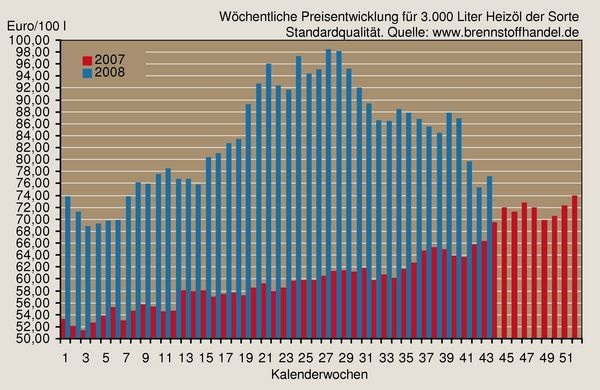 Die Heizölpreisentwicklung laut „Preise und Preisindizes für gewerbliche Produkte“ des Statistischen Bundesamts bei Lieferung in TKW an Verbraucher frei Verbraucher bei 4000 bis 5000 l pro Auftrag weist für September 2008 einen Preis von 79,04 Euro/100 l aus (-3,8% über dem Vormonat, +24,7% über dem Vorjahresmonat). Dieser Mittelwert wird aus den Preisen für Kiel, Hamburg, Hannover, Düsseldorf, Frankfurt am Main, Mannheim/Ludwigshafen, Stuttgart, München, Berlin, Rostock, Magdeburg und Dresden, inkl. Mineralölsteuer, Ökosteuer, Erdölbevorratungsbeitrag und Mehrwertsteuer jeweils am 15. des Monats ermittelt. ToR