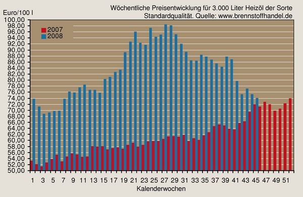 im Bundesdurchschnitt 74,05 Euro/100 l und verbilligt sich gegenüber der Vorwoche um 1,30 Euro/100 l. Der Heizölpreis lag in der 45. KW um 24,43 Euro/100 l unter dem bisherigen Allzeithoch von 98,48 Euro/100 l aus der 27. KW 2008.
