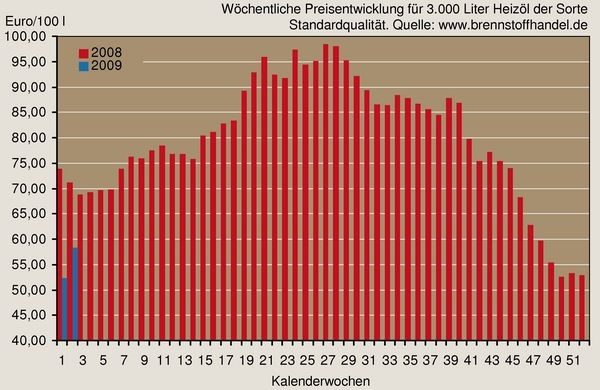 im Bundesdurchschnitt 58,27 Euro/100 l und verteuerte sich gegenüber der Vorwoche um 6,02 Euro/100 l. Der Heizölpreis lag in der 02. KW um 40,21 Euro/100 l unter dem bisherigen Allzeithoch von 98,48 Euro/100 l aus der 27. KW 2008.