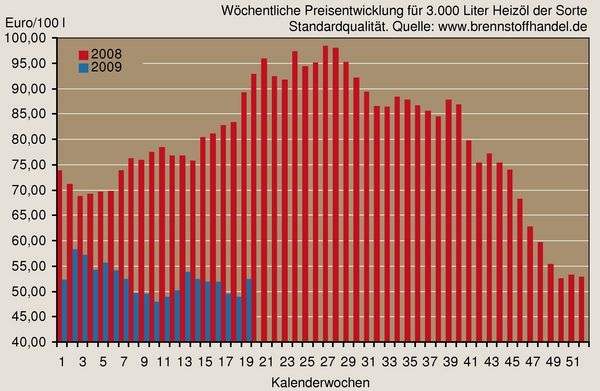 im Bundesdurchschnitt 52,45 Euro/100 l und verteuerte sich gegenüber der Vorwoche um 3,49 Euro/100 l. Der Heizölpreis lag in der 19. KW um 46,03 Euro/100 l unter dem bisherigen Allzeithoch von 98,48 Euro/100 l aus der 27. KW 2008.