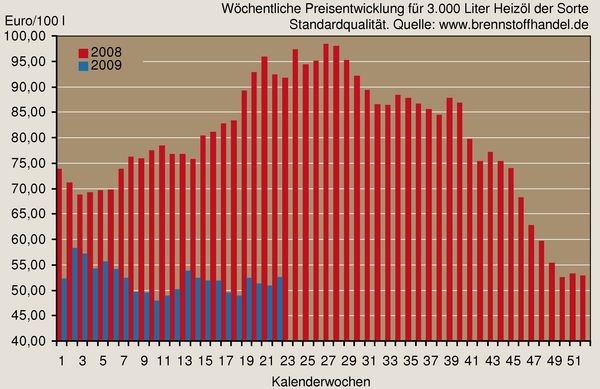 im Bundesdurchschnitt 52,56 Euro/100 l und verteuerte sich gegenüber der Vorwoche um 1,59 Euro/100 l. Der Heizölpreis lag in der 22. KW um 45,92 Euro/100 l unter dem bisherigen Allzeithoch von 98,48 Euro/100 l aus der 27. KW 2008.
