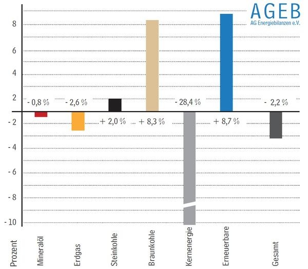 Der Verbrauch von Steinkohle nahm leicht zu. Einem Anstieg des Einsatzes in Kraftwerken zur Strom- und Wärmeerzeugung stand ein leicht verringerter Bedarf der Stahlindustrie gegenüber. Der Verbrauch an Braunkohle stieg infolge der Inbetriebnahme von zwei neuen Kraftwerken um rund 8 %. Im weiteren Jahresverlauf werden mehrere Altanlagen vom Netz gehen. Die Kernenergie verringerte ihren Beitrag im Zuge des Ausstiegsbeschlusses um fast 30 %.