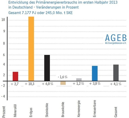 Der Primärenergieverbrauch in Deutschland lag 2013 voraussichtlich um etwa 2,6 % über dem Niveau des Vorjahres. Nach vorläufigen Berechnungen der Arbeitsgemeinschaft Energiebilanzen (