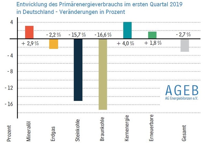 Der Energieverbrauch in Deutschland lag in den ersten drei Monaten des Jahres 2019 knapp 3 % unter dem Vorjahreswert. Nach vorläufigen Berechnungen der Arbeitsgemeinschaft Energiebilanzen ( AG Energiebilanzen ) fiel der Verbrauch im ersten Quartal auf 3730 PJ (1036 TWh).