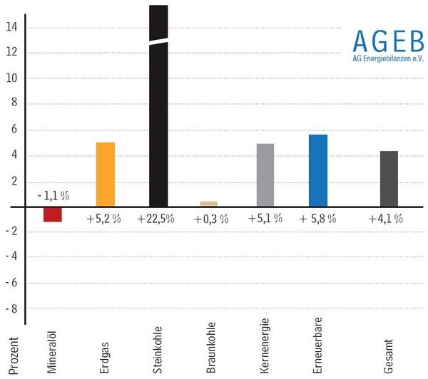 In den ersten neun Monaten des Jahres 2010 stieg der Verbrauch an Primärenergieträgern nach aktuellen Berechnungen der AGEB gegenüber dem Vorjahreszeitraum um 4,1 % auf 10.216 PJ. Der Verbrauch an Mineralöl verringerte sich um gut 1 %. Der Erdgasverbrauch erhöhte sich um 5 %. Der Verbrauch an Steinkohle lag 22,5 % über dem Vorjahreszeitraum, der Primärenergieverbrauch an Braunkohle lag knapp über dem Niveau des Vorjahreszeitraums. Die inländischen Kernkraftwerke erhöhten ihren Beitrag zum Primärenergieverbrauch um gut 5 %, erneuerbaren Energien steigerten ihren Beitrag um knapp 6 %. Die Stromerzeugung aus Wasserkraft (ohne Pumpspeicher) verringerte sich um knapp 3 %, die aus Windkraft ging um 2,8 % zurück. Photovoltaik und Biogas verzeichneten weiter deutliche Zuwächse. Der Anteil aller erneuerbarer Energien am Primärenergieverbrauch stieg leicht auf 9,1 % (Vorjahreszeitraum: 8,9 %). ToR