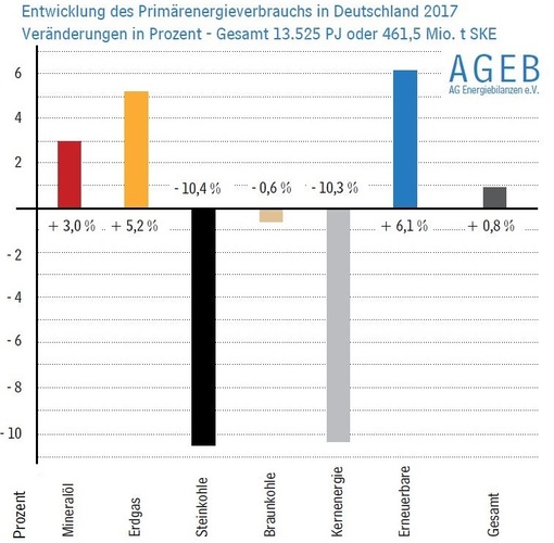 Für den Verbrauchsanstieg ist laut AG Energiebilanzen vor allem die positive Konjunkturentwicklung verantwortlich. Bei den erneuerbaren Energien sorgten im Wesentlichen gute Windverhältnisse an Land und auf See sowie eine etwas höhere Zahl von Sonnenstunden und der Anlagenzubau für höhere Stromeinspeisungen. Bei den energiebedingten CO 2 -Emissionen rechnet die AG Energiebilanzen mit einer stagnierenden Entwicklung.