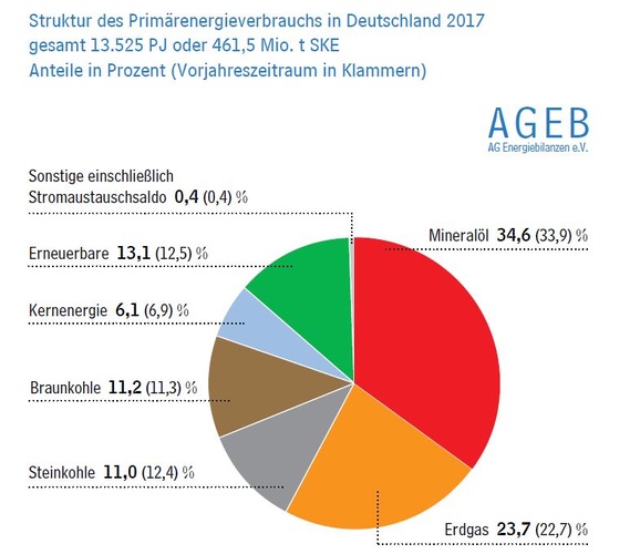 Der Verbrauch von Mineralöl erhöhte sich 2017 in Deutschland insgesamt um 3 % auf 4675 PJ (159,5 Mio. t SKE). Zu dieser Entwicklung trug vor allem der gestiegene Verbrauch an Kraftstoffen bei. Bei Otto- und Dieselkraftstoff kam es zu einem Plus von jeweils rund 2 %. Der Verbrauch von Flugkraftstoff nahm um 0,7 % zu. Der Absatz von leichtem Heizöl verzeichnete einen Zuwachs von rund 2 % und die Rohbenzinlieferungen an die chemische Industrie stiegen um etwas über 7 %.