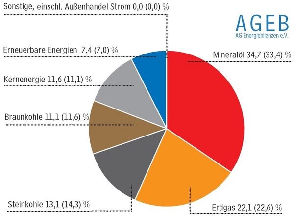 Die Erneuerbaren Energien steigerten ihren Anteil am Primärenergieverbrauch leicht auf 7,4 (Vorjahr: 7,0%). Der Anteil Erneuerbarer Energien wurde durch einem Anstieg bei der Biomasse und der Windenergie bestimmt.