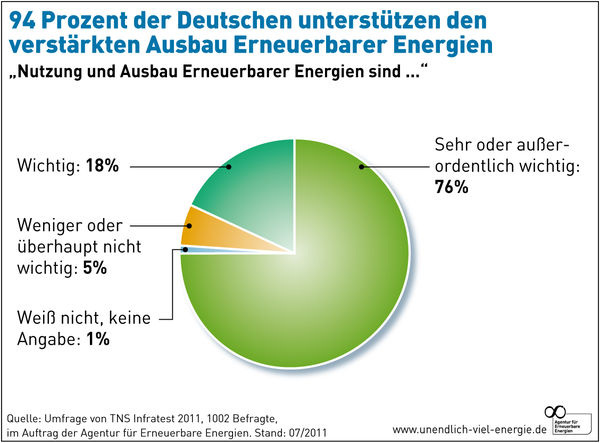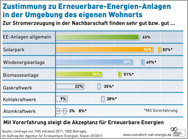 „Die stabile hohe Zustimmung zum Ausbau der erneuerbaren Energien ist ein klares Votum der Bevölkerung für eine rasche und konsequente Energiewende“, folgert Philipp Vohrer, Geschäftsführer der Agentur für Erneuerbare Energien. Dies gilt selbst dann, wenn die Erneuerbare-Energien-Anlagen in Wohnortnähe der Befragten errichtet werden, so das Ergebnis der Umfrage: Rund 65 % der Bürger finden Ökostromkraftwerke in ihrer Nachbarschaft „sehr gut“ oder „gut“. Die konkrete Zustimmung liegt sogar noch höher, wenn die Befragten etwa mit Windenergieanlagen oder Solarparks in ihrer unmittelbaren Wohnumgebung bereits Erfahrungen gemacht haben.