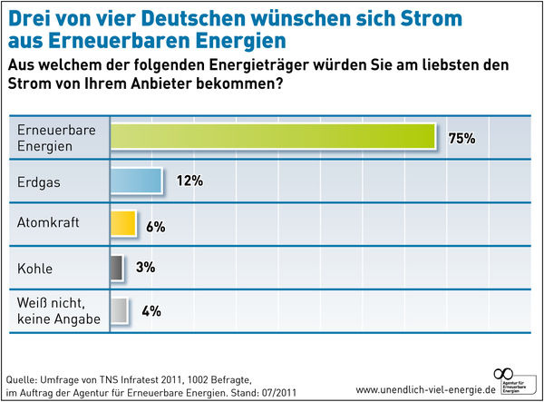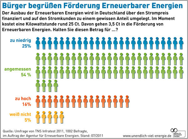 Die hohe Akzeptanz der erneuerbaren Energien erklärt auch die Bereitschaft, die Kosten für ihre Förderung zu tragen: Laut TNS Infratest halten 79,4 % der Befragten die derzeitige Umlage von 3,5 Ct/kWh für „angemessen“ oder sogar für „zu niedrig“, nur 15 % schätzen sie als „zu hoch“ ein. „Der Ausbau erneuerbarer Energien bringt nicht nur Kosten, sondern vor allem auch einen erheblichen Nutzen mit sich: in Form von Klimaschutz, Versorgungssicherheit für kommende Generationen und Importunabhängigkeit. Die Mehrheit der Bevölkerung sieht diese Vorteile und ist deshalb willens, die Energiewende auch zu finanzieren“, kommentiert Vohrer die Umfrageergebnisse.
