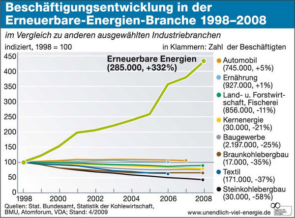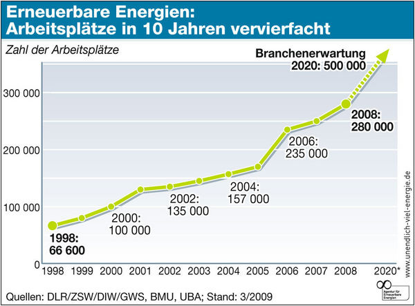 Der Bedarf an Fachkräften ist im Bereich erneuerbare Energien trotz Wirtschaftskrise weiterhin hoch: Einer Untersuchung des Wissenschaftsladens Bonn zufolge ist die Zahl der Stellenangebote im ersten Quartal 2009 im Vergleich zum Vorjahr um 25 % gestiegen. Diesen Trend haben auch Universitäten und Fachhochschulen erkannt. Mehr als 250 Studiengänge setzen einen Schwerpunkt in diesem Bereich. Über Studium, Ausbildung und Berufseinstieg in die Branche der erneuerbaren Energien informiert www.erneuerbare-karriere.de . Das neue Online-Angebot der Agentur für Erneuerbare Energien liefert Schülern, Studenten, Berufsanfängern und Quereinsteigern Wissenswertes zum Arbeitsmarkt der erneuerbaren Energien. ToR
