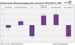 Den Daten zufolge geht der Zuwachs vor allem auf den Export (Stromhandelssaldo) von Strom zurück. 2013 produzierten Kohlekraftwerke 8,9 TWh mehr als 2012, gleichzeitig wuchs der Export um 9,9 auf 33 TWh und damit auf einen neuen Rekordwert. Gleichzeitig zeigen die Daten, dass der innerdeutsche Stromverbrauch leicht gesunken ist: Er verminderte sich um 10,7 auf 596 TWh. Der Rückgang entspricht fast genau der verminderten Produktion von Gaskraftwerken, die aufgrund von äußerst geringen Preisen an der Strombörse kaum mehr wirtschaftlich arbeiten können. Infolge des gesunkenen Inlandverbrauchs bei gestiegenem Export blieb die Stromerzeugung mit 629 (2012: 629,8) TWh konstant. ■