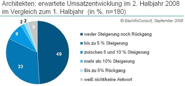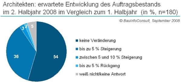 telefonisch zu ihren Erwartungen fürs zweite Halbjahr 2008 befragten Hochbauarchitekten: 93% der Befragten rechnen damit, dass sich ihr Umsatz im zweiten Halbjahr 2008 gegenüber dem ersten Halbjahr steigern oder zumindest nicht verschlechtern wird. Das liegt sicher auch daran, dass sich der Auftragsbestand der meisten befragten Firmen nach eigener Einschätzung keineswegs schlecht entwickeln wird.