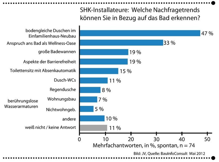 in seiner telefonischen Befragung zur Jahresanalyse 2012/2013 nach den wichtigsten Nachfragtrends im Bad gefragt hat. Ein Drittel der Befragten bestätigte, dass sich der Anspruch ans Bad als Wellness-Oase ausweitet. Der Stellenwert des Komforts im Bad drückt sich auch im Wunsch nach einer großen Badewanne (19 %), Dusch-WCs (11 %) oder auch Regenduschen (8 %) und berührungslosen Armaturen (5 bzw. 7 %) aus.