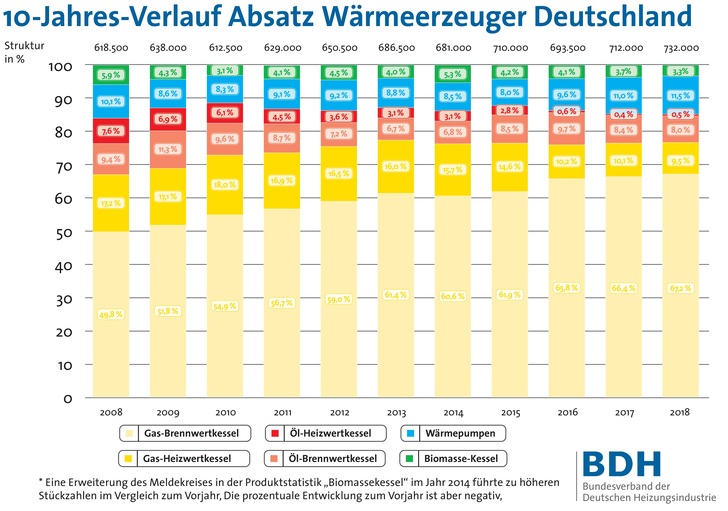 Auch 2018 gab es keine Initialzündung für die Wärmewende, beklagt der Bundesverband der Deutschen Heizungsindustrie ( BDH ) bei der Vorstellung seiner Jahresbilanz. Zwar konnten die im BDH organisierten Hersteller mit 732.000 abgesetzten Wärmeerzeugern insgesamt ein Plus von 3 % gegenüber dem Vorjahr erzielen. Dieses Plus resultiert jedoch ausschließlich aus dem nach wie vor dynamischen Neubaugeschäft.