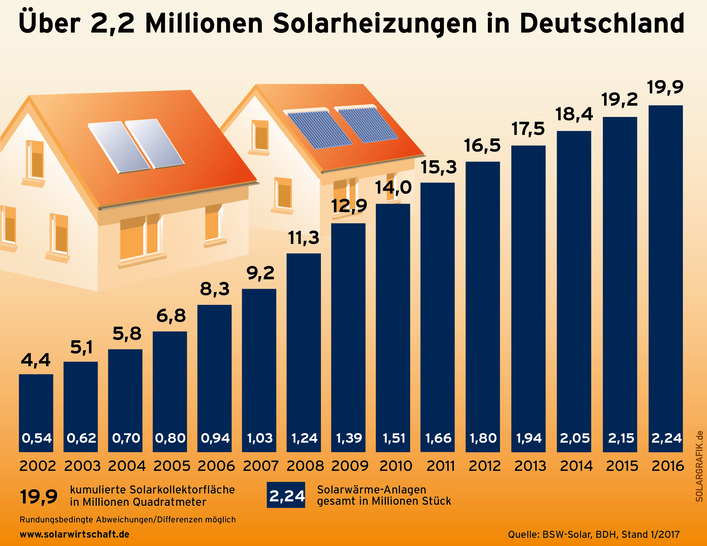 Die Zahl der Solarwärmeanlagen in Deutschland ist im vergangenen Jahr um knapp 100.000 gewachsen. Ende 2016 waren damit hierzulande etwa 2,2 Mio. Solarwärmeanlagen in Betrieb. Das teilen der Bundesverband der Deutschen Heizungsindustrie ( BDH ) und der Bundesverband Solarwirtschaft ( BSW-Solar ) mit.