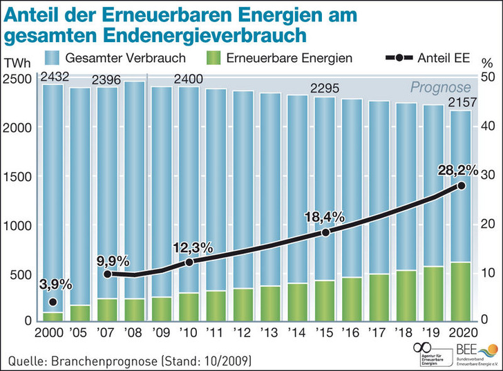 Erneuerbare Energien decken 2020 insgesamt 28 % des gesamten Endenergieverbrauchs in Deutschland, wenn die neue Bundesregierung die richtigen Rahmenbedingungen setzt. Das ist das Ergebnis der Branchenprognosen für die Bereiche Wärme, Verkehr und Strom, die der Bundesverband Erneuerbare Energie (