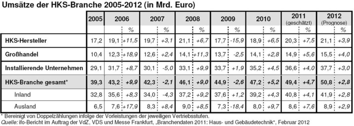 Nach einer Zunahme des Umsatzes von 6,5 % im Jahr 2010 haben die Hersteller der Heizungs-, Klima- und Sanitärindustrie (HKS-Hersteller) 2011 um 7,5 % höhere Umsätze erwirtschaftet. Für 2012 sagt das ifo-Institut einen weiteren, allerdings schwächeren Umsatzanstieg der HKS-Hersteller um 3,9 % voraus.