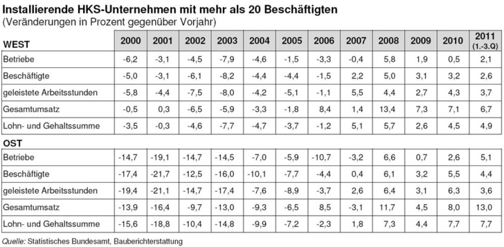 Für die installierenden Unternehmen mit mehr als 20 Beschäftigten zeichnet sich für das Jahr 2011 eine weiterhin günstige konjunkturelle Situation ab. Die bisher für die ersten drei Quartale 2011 vorliegenden amtlichen Daten dokumentieren eine positive Entwicklung.