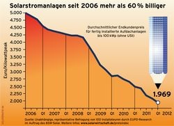 Im gleichen Zeitraum ist es der Solarbranche durch eine Vielzahl von Innovationen und Rationalisierungsmaßnahmen gelungen, die Preise für schlüsselfertige Solarstromanlagen zu halbieren und damit die wiederholte Reduktion der Solarstrom-Förderung weitgehend zu kompensieren. Der weitere Ausbau der Solarstrom-Nutzung wirkt sich damit kaum noch auf die Verbraucher-Strompreise aus, erläutert Carsten Körnig, Hauptgeschäftsführer des Bundesverbandes Solarwirtschaft (