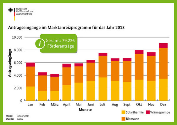 Das BAFA hat für 2013 das fast ausschließlich Modernisierern vorbehaltene Marktanreizprogramm eine Zunahme von 7 % bei den nach der Installation einzureichenden Förderanträgen auf 33.740 gemeldet (siehe Linkempfehlung am Ende des Artikels). Offensichtlich hat der Markt insbesondere Fläche im Neubausegment verloren, was beim nahe zurückliegenden Neubauvolumen eine Konsequenz aus der stärkeren Verbreitung von Wärmepumpen und Fernwärme sein dürfte.
