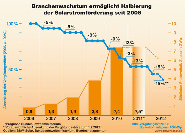 Unter der schwarz-gelben Bundesregierung wird die Solarförderung damit binnen zweieinhalb Jahren nahezu halbiert. Mit Vergütungszahlungen zwischen aktuell 17,94 und 24,43 Ct/kWh liegt die Vergütung für Solarstrom aus neuen Anlagen in allen Klassen damit bereits seit dem 1. Januar 2012 auf dem Preisniveau privater Haushaltsstromtarife. Zum 1. Juli 2012 sinkt die Vergütung mit großer Wahrscheinlichkeit auf 15,25 bis 20,77 Ct/kWh (niedrige Werte für Freiflächenanlagen, höhere Werte für kleine Dachanlagen). Carsten Körnig, Hauptgeschäftsführer des BSW-Solar: „Die gesetzliche Kostenbremse greift. Neu installierte Photovoltaik-Anlagen haben künftig nur noch einen geringen Einfluss auf die Verbraucherumlage für Erneuerbare Energien.“ Durch das starke Wachstum der Photovoltaik steigt ihr Anteil am deutschen Stromverbrauch 2012 auf über 4 % (Bericht von TGA Fachplaner: 2011 stieg die Solarstrom-Erzeugung um 60 %).