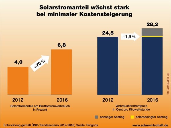 ) in den nächsten vier Jahren um 70 % zulegen, von rund 4 % im Jahr 2012 auf etwa 7 % im Jahr 2016. Die Strompreise steigen dadurch nach Angaben der Prognos AG um knapp 2%. Dies ist das zentrale Ergebnis eines heute gemeinsam mit der Prognos AG in Berlin vorgestellten Kurzgutachtens. „Durch die bereits realisierten Förderkürzungen sind die Kosten für den Ausbau der Photovoltaik unter Kontrolle“, so Carsten Körnig, BSW-Solar-Hauptgeschäftsführer.