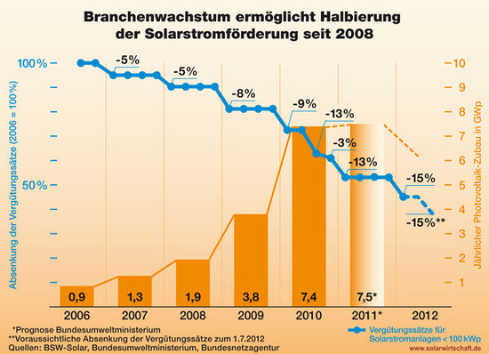 „Die Energiewende kostet Geld, vor allem in der Anschubphase. Die mit dem weiteren Ausbau der Solarenergie verbundenen Investitionen steigen jedoch kaum noch und zahlen sich aus“, so Körnig. Vielen, die jetzt eine weitere Kürzung der Förderung forderten, sei nicht bewusst, dass der starke Zubau von Solarstromanlagen in den vergangenen drei Jahren bereits zu einer Halbierung der Fördersätze geführt habe. 2012 wird die Solarstromförderung nach dem erst im Sommer 2011 verschärften Fördergesetz EEG um nochmals 27 % gekürzt (Bericht von TGA Fachplaner).