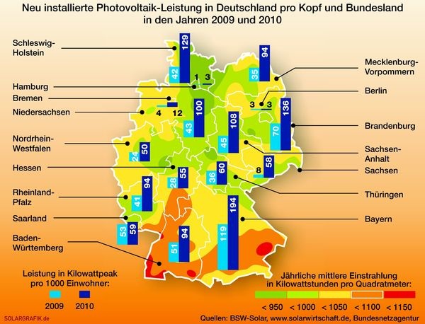 Im Ländervergleich belegt Bayern unangefochten den Spitzenplatz beim absoluten Zubau (32,8 % der neu installierten Jahresgesamtleistung), gefolgt von Baden-Württemberg (13,6 %), Nordrhein-Westfalen (12,2 %) und Niedersachsen (10,8 %). Betrachtet man die Neuinstallation pro Kopf im Ländervergleich, folgen auf Bayern (194 W p /Einwohner) die Länder Brandenburg (136 W p /Einwohner) und Schleswig-Holstein (129 W p /Einwohner). Mecklenburg-Vorpommern lag 2010 bei der Pro-Kopf-Neuinstallation 2010 mit Baden-Württemberg gleichauf (beide 94 W p /Einwohner).
