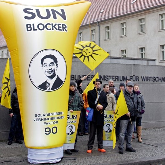 Die Solarbranche hat am 17. Februar vor dem Bundeswirtschaftsministerium gegen die radikalen Kürzungspläne von Wirtschaftsminister Dr. Philipp Rösler bei der Solarstromförderung protestiert. Mit einer überdimensionalen, gelben „Sunblocker“-Tube mit dem Konterfei des Ministers erinnerten sie ihn daran, dass er als Wirtschaftsminister auch für den Erhalt der Solarwirtschaft mit ihren weit über 100.000 Beschäftigten zuständig ist.