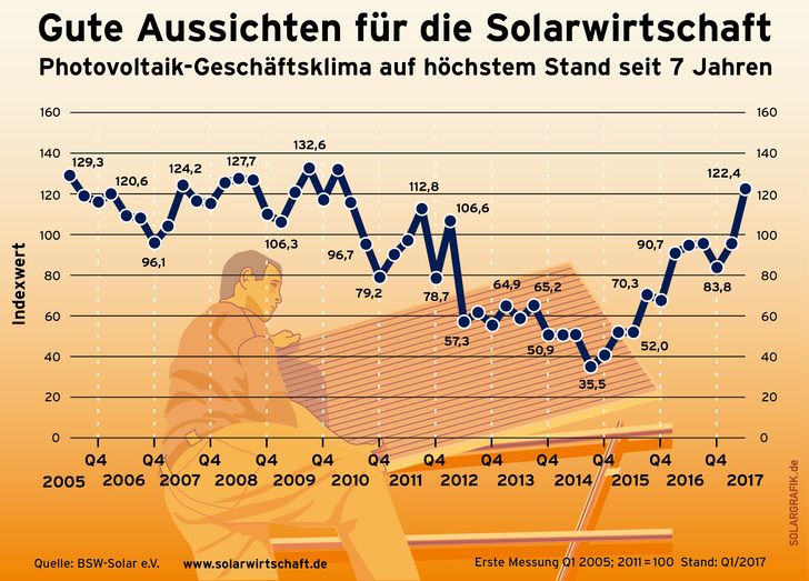 Nach einem jahrelangen Rückgang der Nachfrage hat die heimische Solarbranche die Talsohle durchschritten. Das spiegelt sich in dem Photovoltaik-Geschäftsklimaindex des Bundesverbands Solarwirtschaft ( BSW-Solar ) wider, der auf dem höchsten Stand seit sieben Jahren angekommen ist.