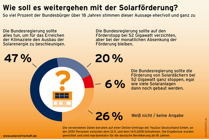 Nach einer repräsentativen Online-Befragung des Meinungsforschungsinstituts YouGov vom November 2018 hält es nur 6 % der erwachsenen Bevölkerung in Deutschland für richtig, die Förderung von Solardächern bei 52 GW ganz zu stoppen, egal wie viele Solaranlagen dann noch gebaut werden. Die überwiegende Mehrheit der Bürger (75 %) – quer durch alle Wähler- und Bevölkerungsschichten – ist hingegen der Auffassung, dass die Bundesregierung mit ihrer Politik sicherstellen sollte, dass genügend Solaranlagen gebaut werden, um die Klimaschutzziele zu erreichen. Die verwendeten Daten beruhen auf einer Online-Umfrage der YouGov Deutschland GmbH, an der 2051 Personen zwischen dem 12.11. und dem 14.11.2018 teilnahmen. Die Ergebnisse wurden gewichtet und sind repräsentativ für die deutsche Bevölkerung ab 18 Jahren ( komplette Ergebnisse der Befragung ).