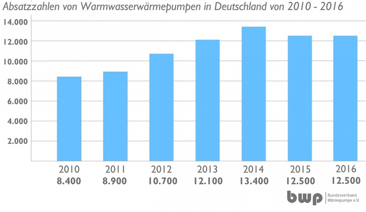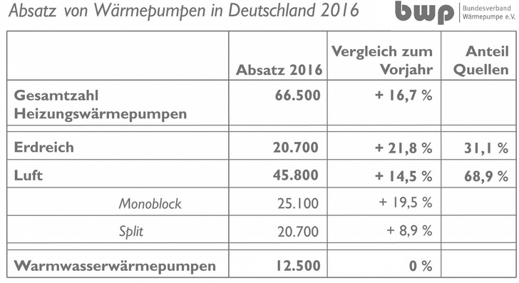 Die Marktanteile zwischen erdgekoppelten Wärmepumpen und Luft/Wasser-Wärmepumpen verändern sich gegenüber dem Vorjahr kaum: Luft/Wasser-Wärmepumpen dominierten auch 2016 mit 68,9 % den Absatz (Vorjahr: 70,2 %). Erdgekoppelte Wärmepumpen legten leicht auf 31,1 % zu (2015: 29,8). Der Absatz von Warmwasserwärmepumpen blieb mit 12.500 Geräten gegenüber dem Vorjahr unverändert.