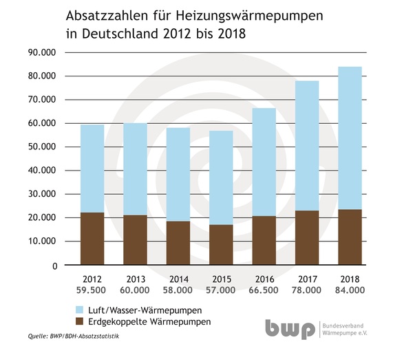 Erdgekoppelte Systeme (inklusive Grundwasser-Wärmepumpen) legten mit 23.500 Geräten gegenüber dem Vorjahr um 2 % zu. Die Marktanteile zwischen erdgekoppelten Wärmepumpen und Luftwärmepumpen haben sich gegenüber dem Vorjahr kaum verändert: So machten Luft/Wasser-Wärmepumpen mit rund 72 % den Großteil des Wärmepumpen-Absatzes aus (2017: 71 %). Erdgekoppelte Wärmepumpen und sonstige liegen bei 28 % (2017: 29 %).