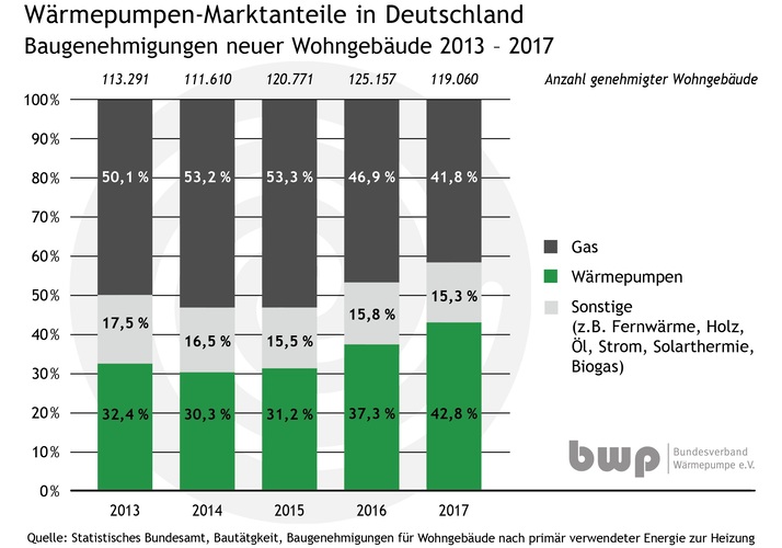In der Gesamtbetrachtung des Neubaumarktes 2017 haben Wärmepumpen den ersten Platz nur knapp verpasst und liegen mit einem Anteil von 41 % noch hinter Gas (42 %). Dass die Wärmepumpe bei der Betrachtung aller Baugenehmigungen nicht führt, liegt an den Nichtwohngebäuden, wo Wärmepumpen noch einen relativ schwachen Anteil haben. Sabel: „Allerdings wuchs der Anteil der Wärmepumpen bei Nichtwohngebäuden besonders stark, im Vergleich zu 2015 um 6 Prozentpunkte auf 20 %.“