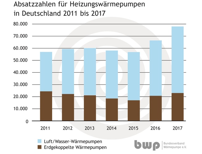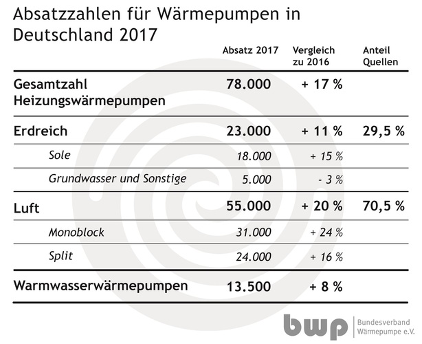 Der größte Zuwachs wurde bei Luft/Wasser-Wärmepumpen verzeichnet: Insgesamt wurden 55.000 Geräte dieser Bauart abgesetzt, das war eine Steigerung von 20 % gegenüber dem Vorjahr. Wie bereits 2016 waren insbesondere Monoblockgeräte (31.000 Stück) mit einem Zuwachs von 24 % gefragt. Bei den Split-Wärmepumpen fiel das Wachstum mit 16 % etwas geringer aus. Erdgekoppelte Systeme (inklusive Grundwasser-Wärmepumpen) legten mit 23.000 Geräten gegenüber dem Vorjahr um 11 % zu.