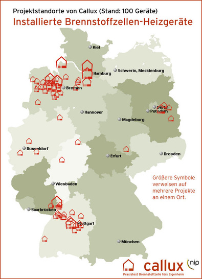 , dem Praxistest Brennstoffzellen fürs Eigenheim, in Betrieb genommen worden. Die Aggregate, die von den fünf beteiligten Energieversorgern in deren Schwerpunktregionen installiert werden, beheizen in der Regel Einfamilienhäuser und versorgen diese zugleich mit Strom. „Indem wir jetzt die Schwelle von 100 betriebsfähigen Geräten überschritten haben, können wir ehrgeizig und realistisch auf die etwa 800 Aggregate blicken, die insgesamt im Rahmen des größten deutschen Praxistests für Brennstoffzellen-Heizgeräte ins Feld gebracht werden sollen“, erläutert Callux-Sprecher Stephan Ramesohl das gemeinsame Vorhaben, bei dem Geräte von Baxi Innotech, Hexis und Vaillant zum Einsatz kommen.
